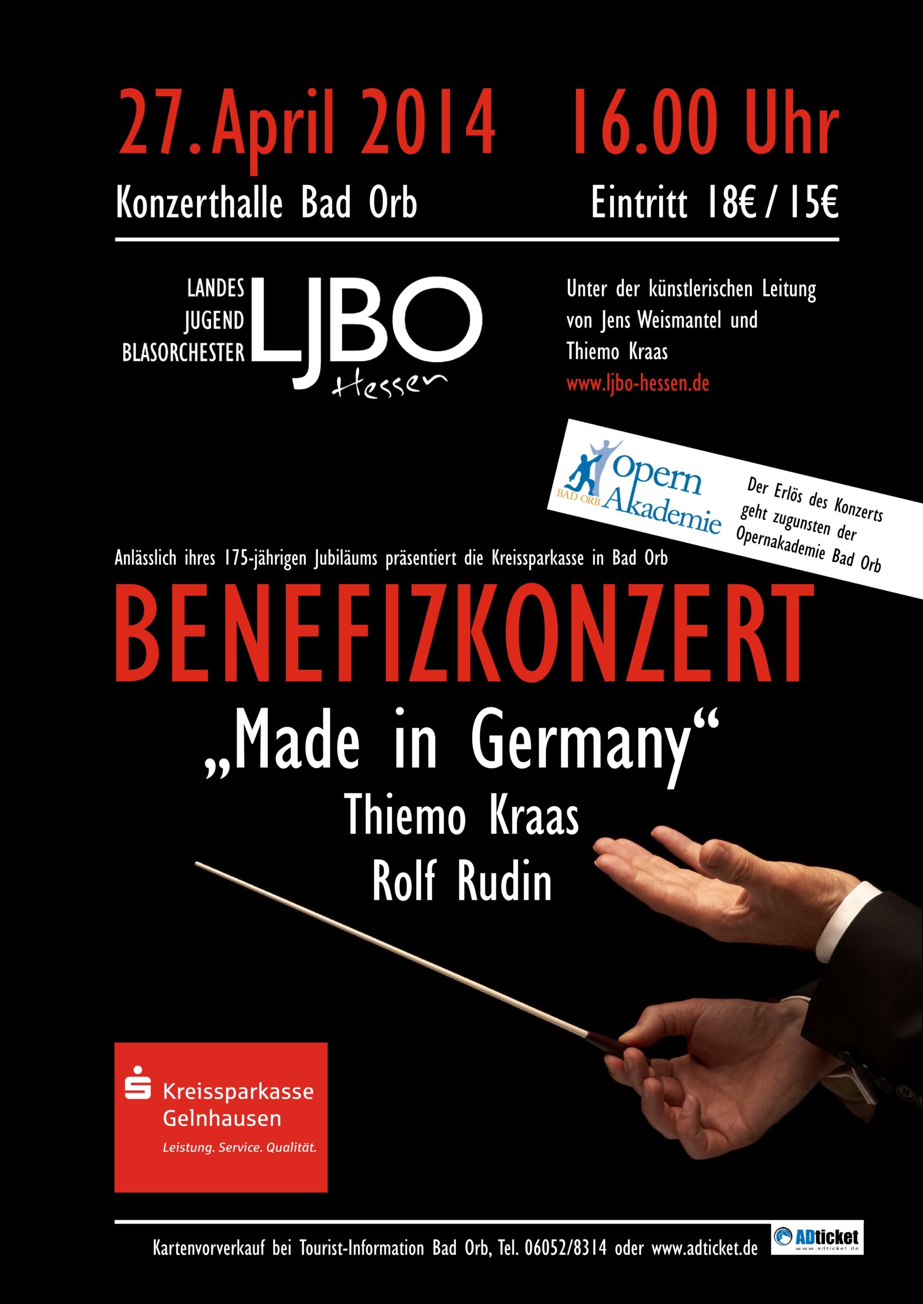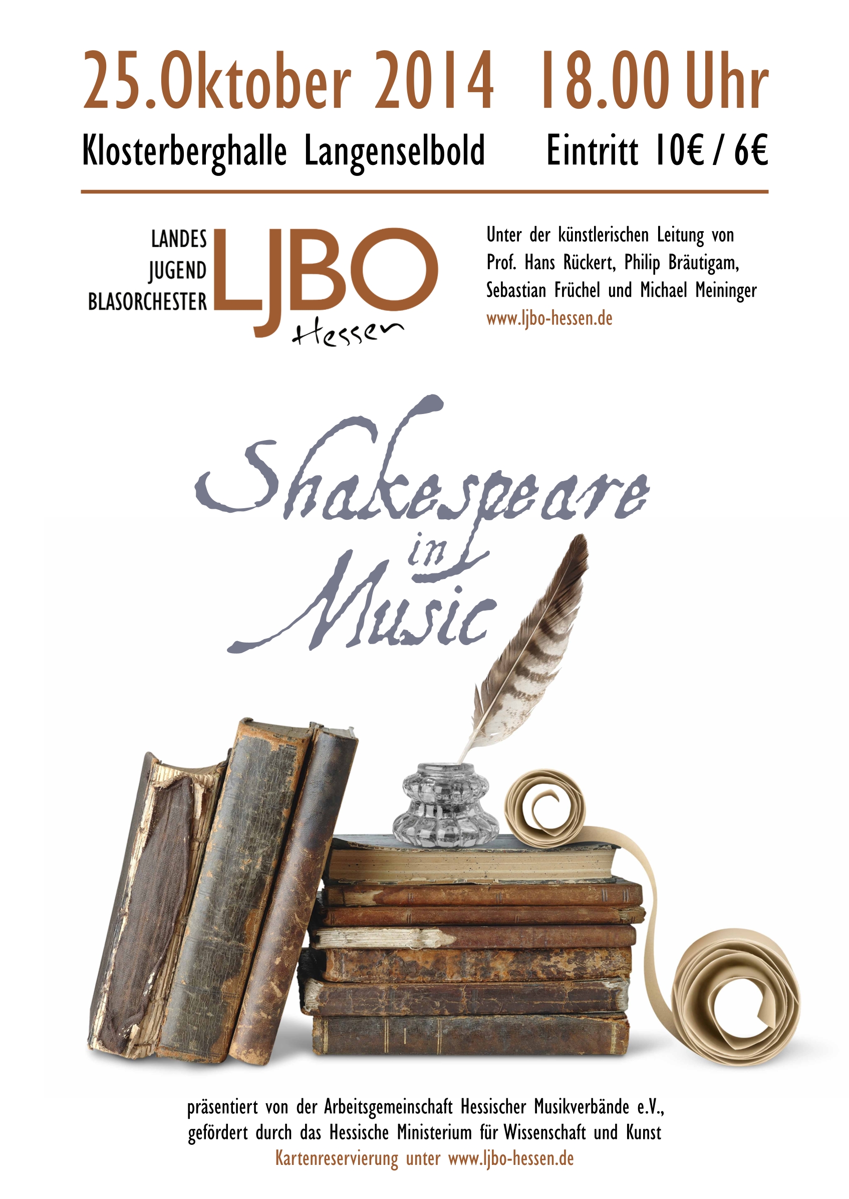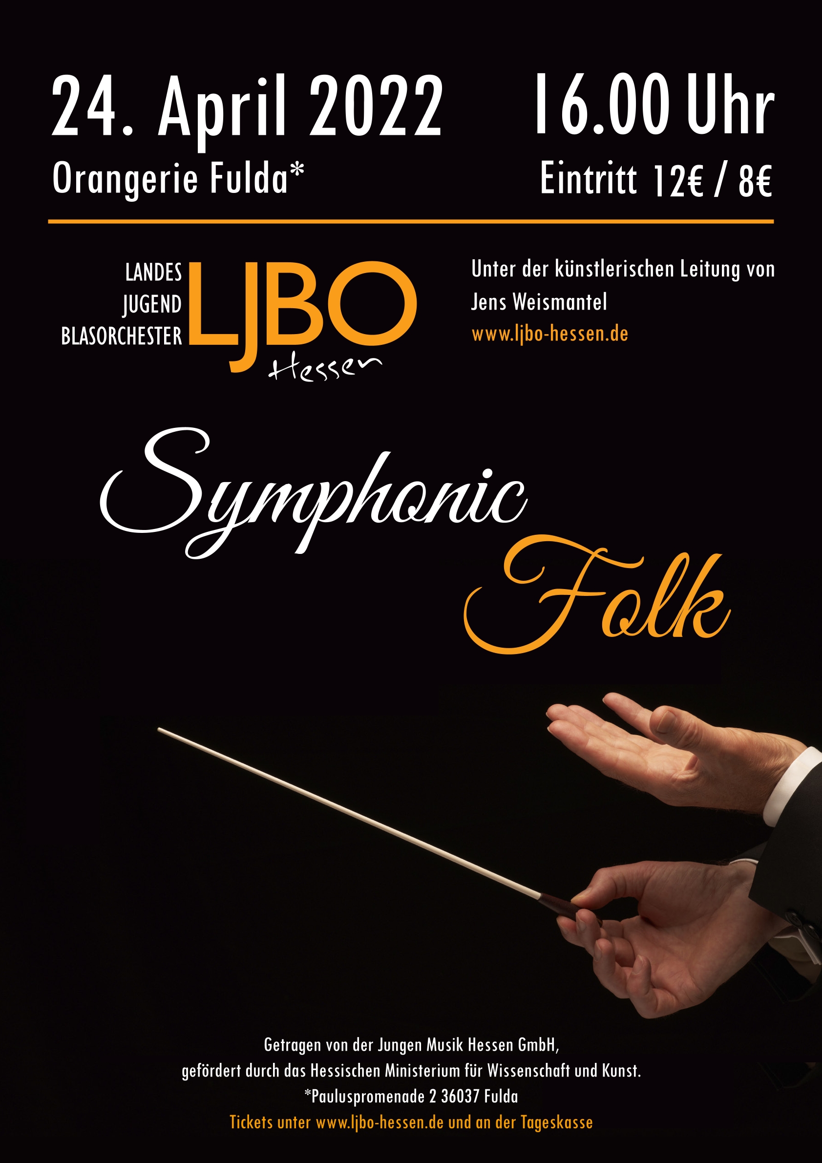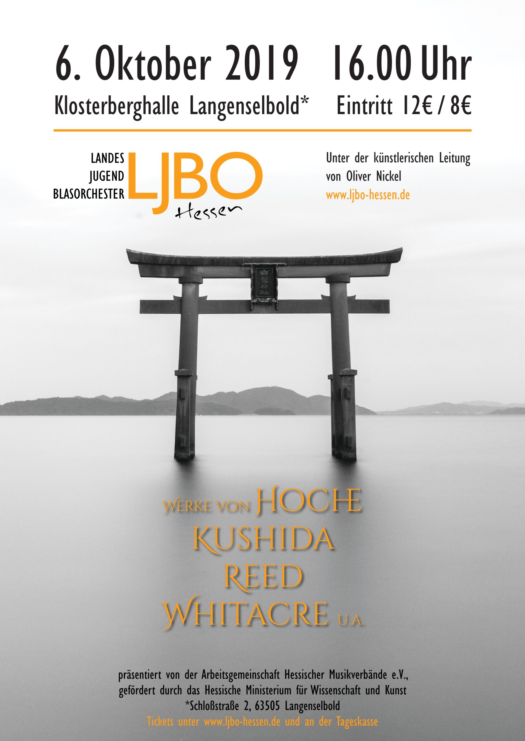 KonzertplakatProgrammMaurice Ravel (bearb. Johan de Meij)Pavane Pour une Infante DefunteBob Margolis (nach Michael Praetorius)TerpsichoreArturo Márquez (beab. Oliver Nickel)Danzón No. 2Leonard Bernstein (bearb. Paul Lavender)Symphonic Dances from West Side StoryLeonard Bernstein, bearb. Paul MurthaGee, Officer KrupkeLeonard Bernstein, bearb. Michael BrownAmerica- ProgrammGustav HolstSecond Suite in FAlfred ReedArmenian Dances (Part I)Hubert HocheMelancholy MomentJoseph SchwantnerIn evening's stillness...Rolf RudinAm Ende des TagesHubert HocheNelasgaHubert HocheIs it the endBob MargolisTerpsichore (nur Ausschnitte)