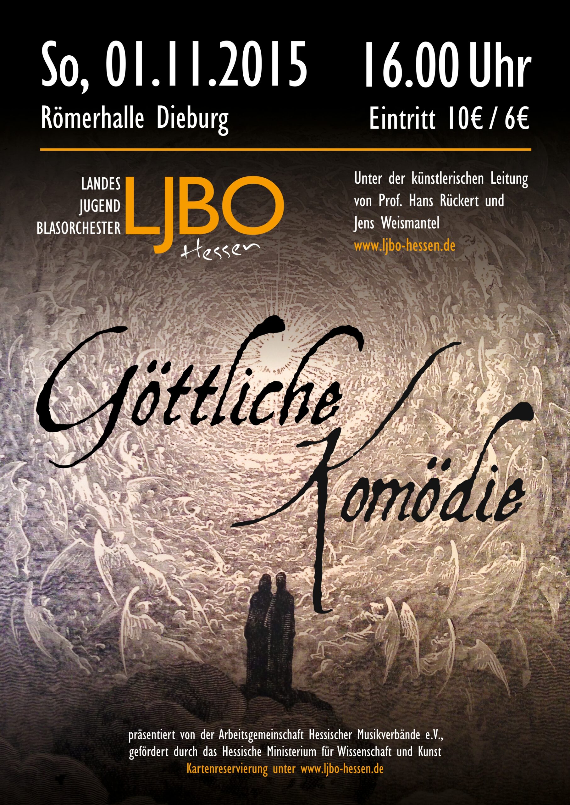 KonzertplakatProgrammJohan de MeijSpringG. F. Händel, arr. Gustav Lenzewski sen.Konzert für Harfe und OrchesterGustav Holst, arr. Colin MatthewsFirst Suite in EsJan van der RoostCrescent MoonRobert W. SmithThe Divine ComedyOster-Arbeitsphase 2015