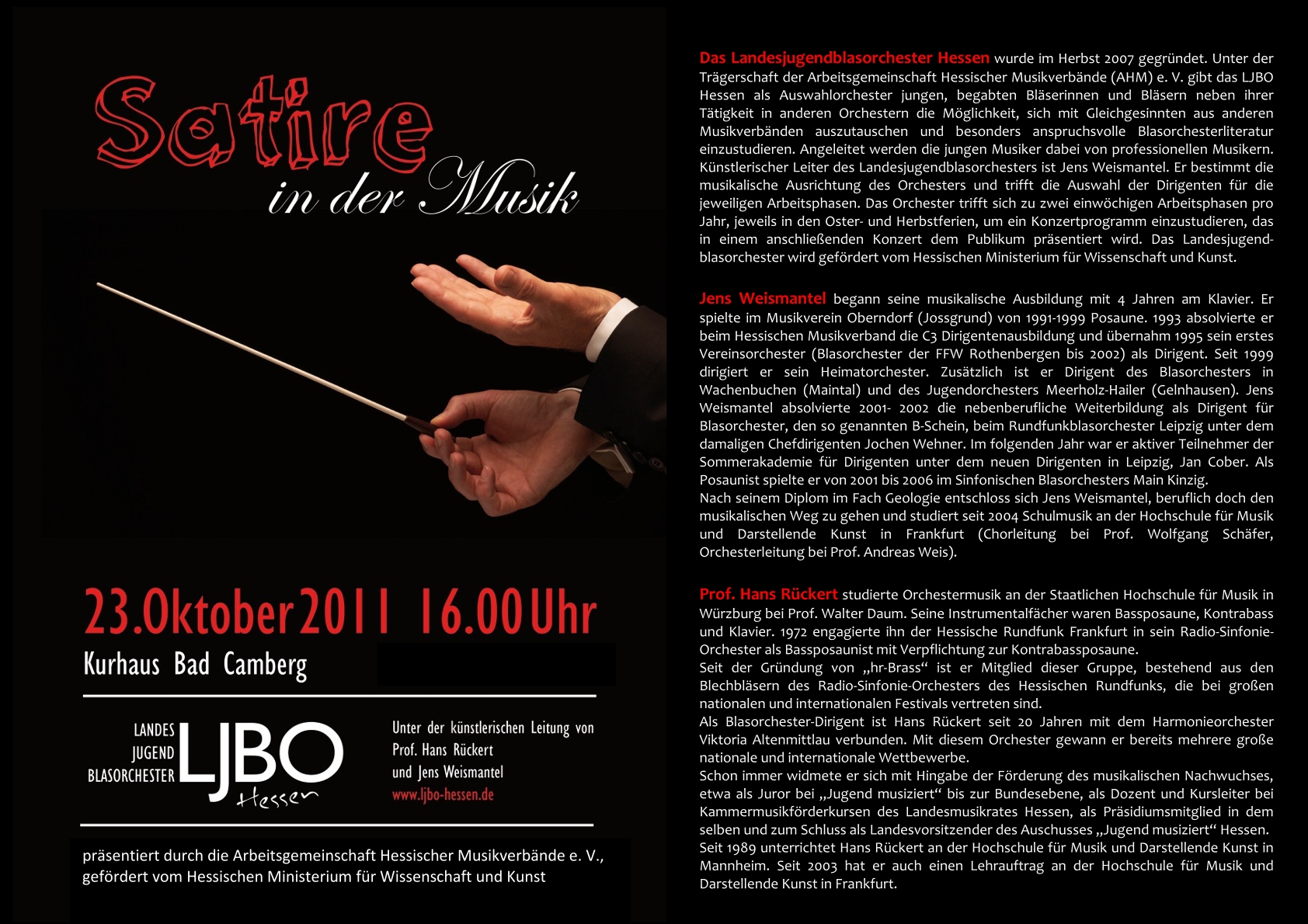 KonzertplakatProgrammLeonard Bernstein, arr. Clare GrundmannSatiric DancesNorman Dello JoioCandide SuiteMaxime AulioLes Voyages de GulliverErik Satie, arr: Johan de MeijRatatouille SatiriqueFranz Lehar, arr. Alfred ReedViliaDmitri Shostakovich, arr. Jan CoberMoscow CheryomushkiJohn Williams, arr. Paul LavenderMarch from 1941Oster-Arbeitsphase 2011